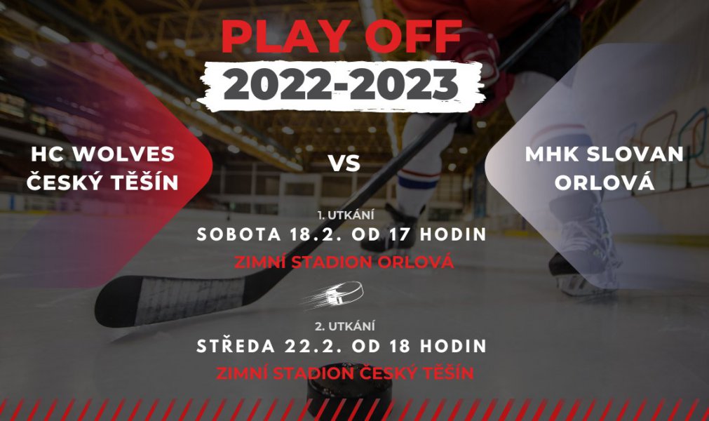 Již známe termíny zápasů čtvrtfinálových utkání HC Wolves. V sobotu 18.2.2023 v 17 hodin vyjedeme na led v Orlové, ve středu 22.2.2023 pak budeme od 18 hodin pokračovat dalším zápasem na domácím českotěšínském ledě. Velmi děkujeme za podporu fanoušků v základní části sezony a doufáme, že budete našim hnacím motorem i pro zápasy v play off.
